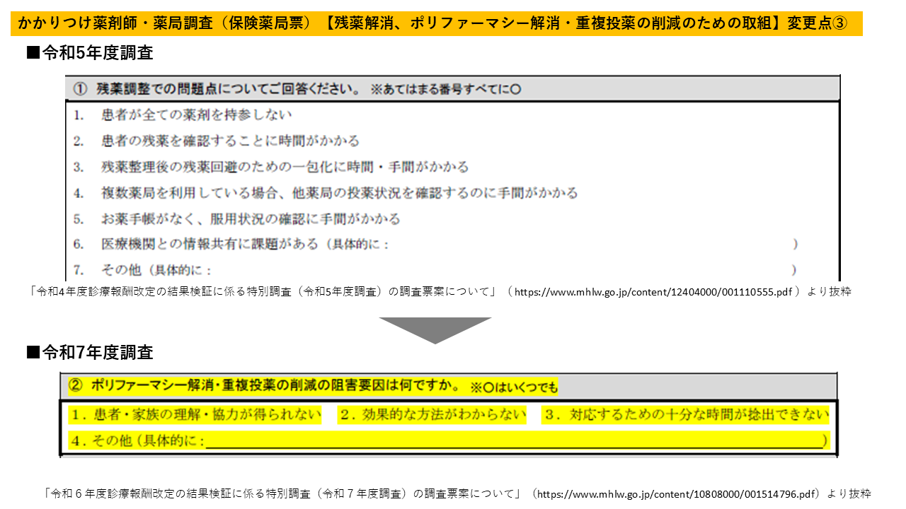 令和7年度調査では、令和5年度調査で設けられていた「残薬解消」に関する個別設問が削除され、内容がポリファーマシー解消や重複投薬削減に焦点を当てた構成へと整理されました。これにより、前段の設問で実施している取り組みを尋ねた上で、阻害要因や課題に関する具体的な回答を求める形に再編されています。