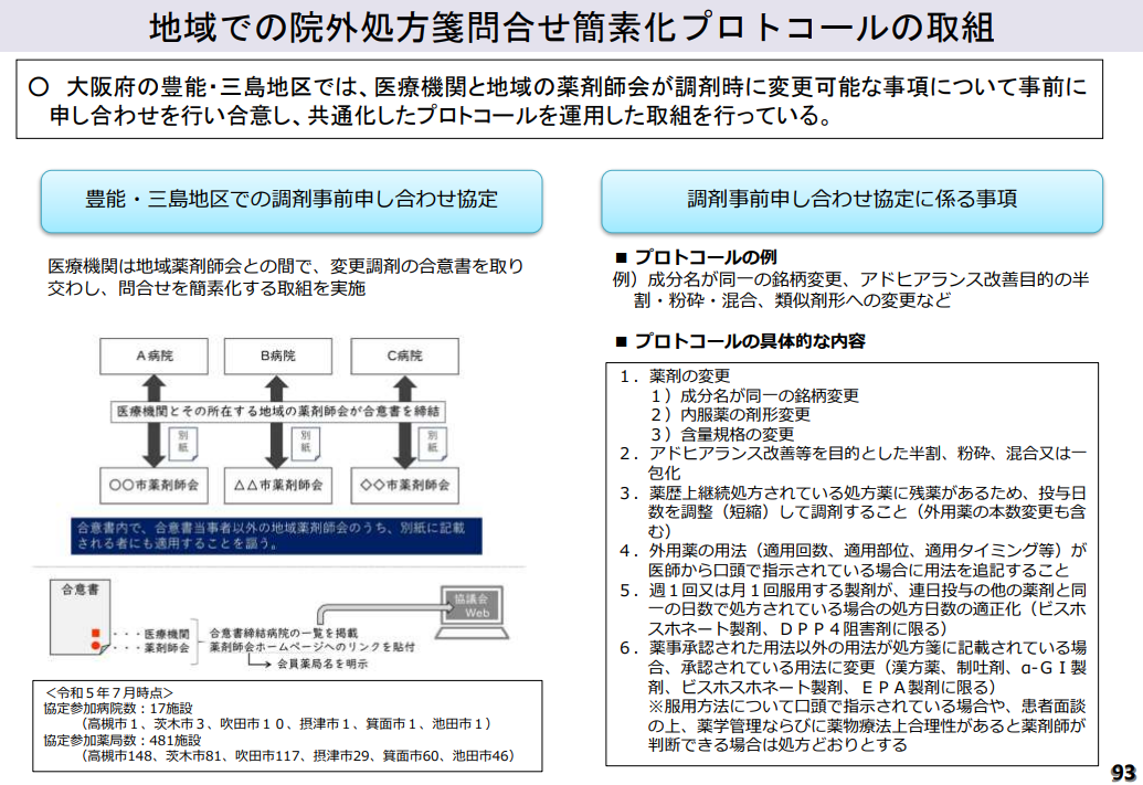加えて、処方箋発行元医療機関への問い合わせにおいて「問い合わせ簡素化プロトコル」を活用しているかを問う設問も新設されました。このプロトコルは、事前に医療機関と薬局間で合意書を取り交わし、変更可能な調剤内容を明確化して問い合わせ手続きを省力化する仕組みで、地域の連携強化に寄与します。実際、大阪府豊能・三島地区では、地域薬剤師会と医療機関が連携し、プロトコルに基づく変更対応を運用しており、その詳細は前回改定時の中医協総会資料にも取り上げられています。