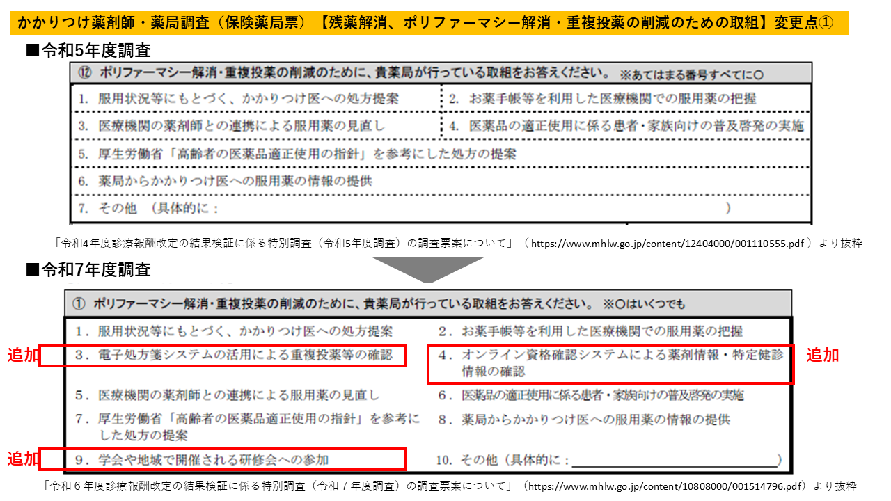 ポリファーマシーの解消や重複投薬の削減に関する取組項目に、「電子処方箋システムの活用による重複投薬等の確認」や「オンライン資格確認システムによる薬剤情報・特定健診情報の確認」、さらに「学会や地域で開催される研修会への参加」が追加されました。