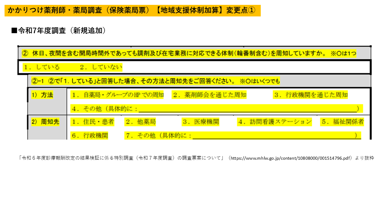 この設問追加の背景には、令和6年度改定で地域支援体制加算の施設基準に「休日・夜間対応体制の整備とその周知」が新たに要件として加えられたことがあります。加算を算定する薬局は、実際に対応体制を整備しているだけでなく、その存在を地域に広く周知することが求められるようになりました。今回の調査は、この要件がどの程度現場で履行されているかを把握し、運用状況を可視化する狙いがあると考えられます。