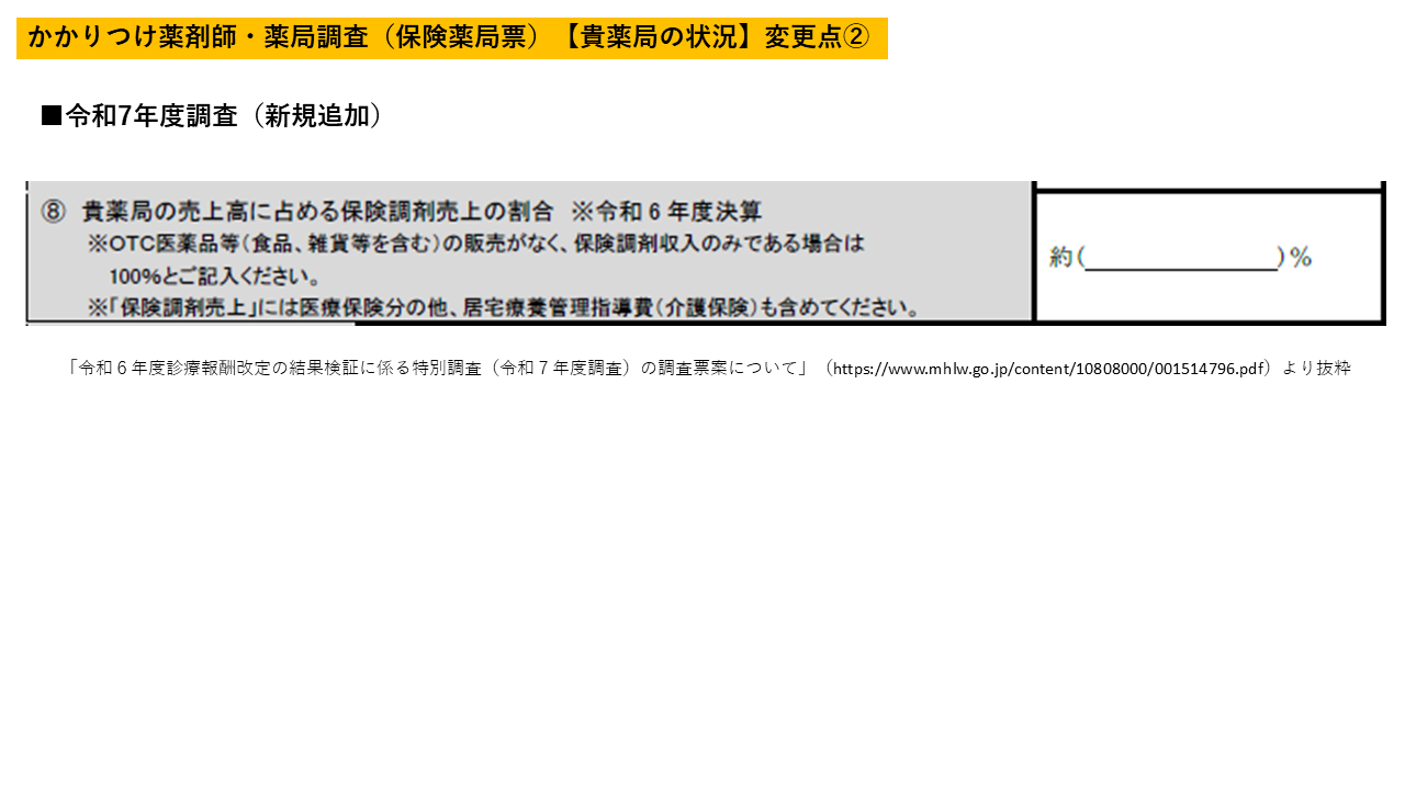 新たに「薬局売上に占める保険調剤の割合」を問う設問が加わりました。これにより、薬局がどの程度、保険調剤を主な収入源としているかが可視化されます。