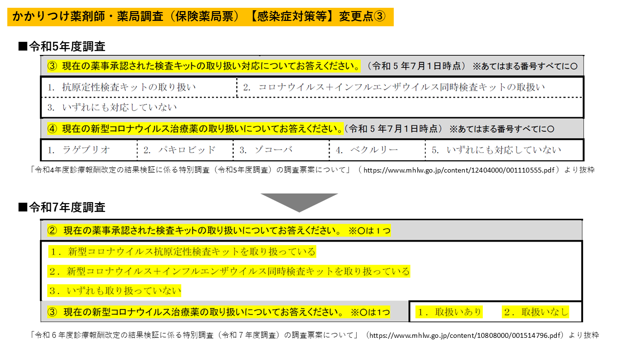 令和7年度調査では、両設問ともに選択肢が整理され、検査キットは「新型コロナ抗原定性検査」「新型コロナ+インフルエンザ同時検査」「いずれもなし」の3択、新型コロナ治療薬は「取り扱いあり/なし」の2択となりました。