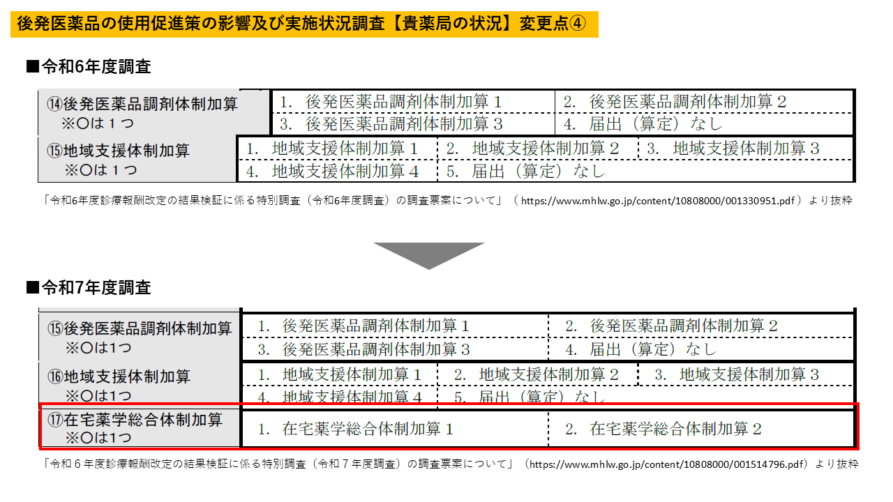 令和7年度調査では、新たに「在宅薬学総合体制加算」の届出状況を問う設問が追加されました。この加算は、前回の診療報酬改定で新設された点数であり、調査票に反映されるのは今回が初めてです。