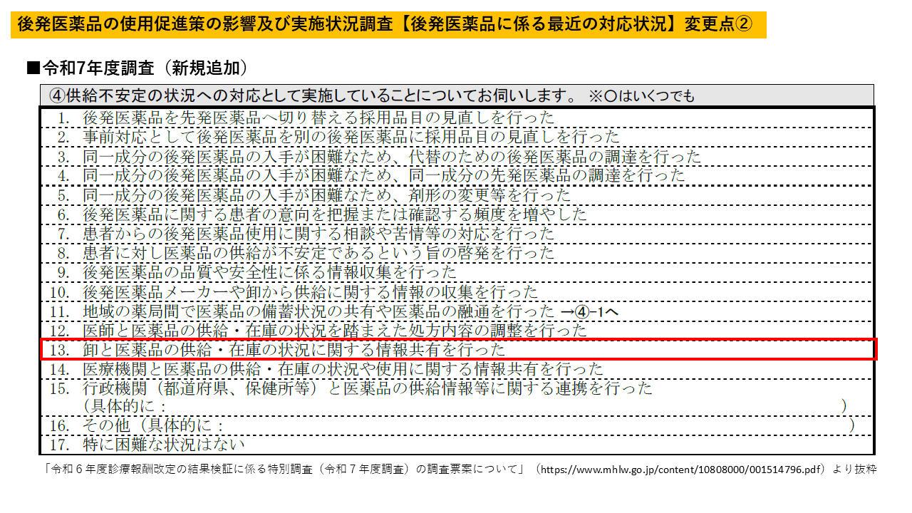 令和7年度調査では、供給不安定時の対応に関する設問に「卸と医薬品の供給・在庫の状況に関する情報共有を行った」の選択肢が新たに追加されました。