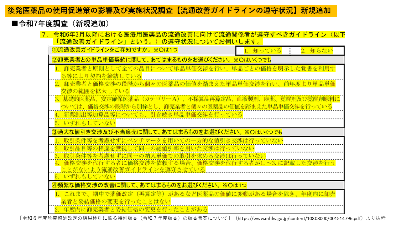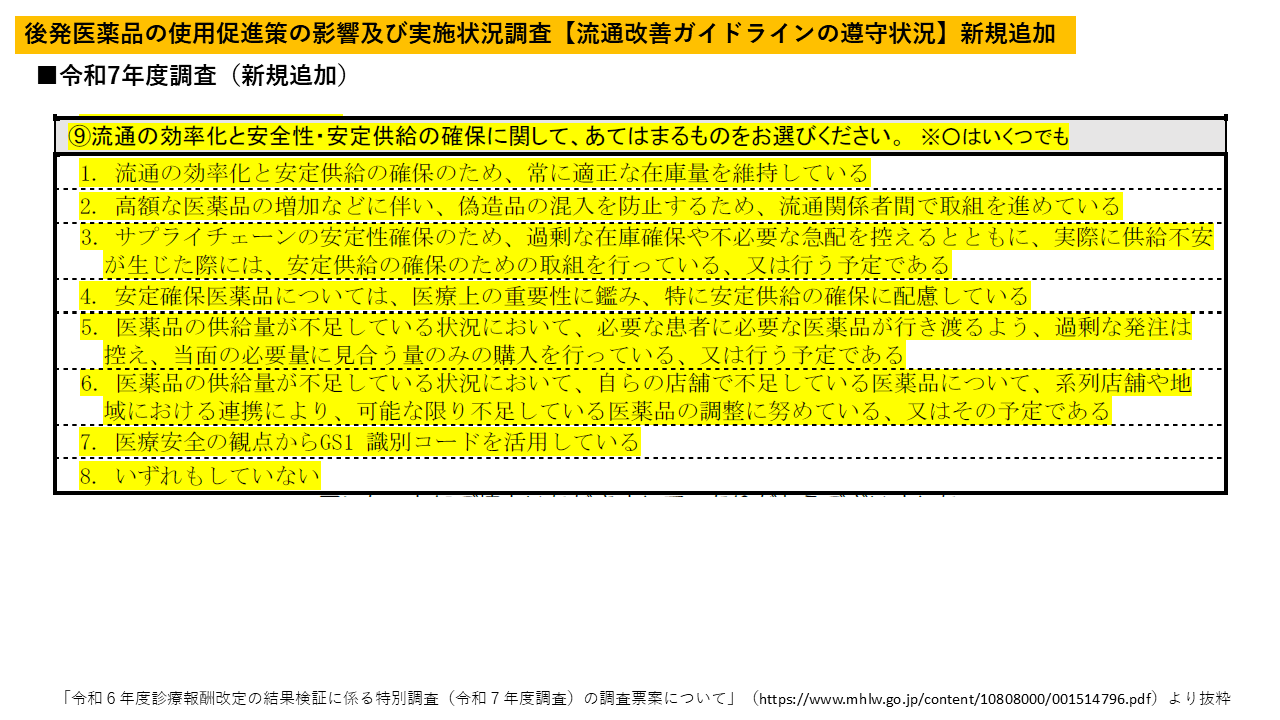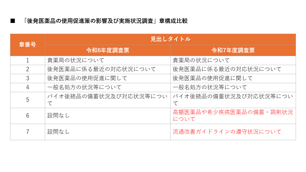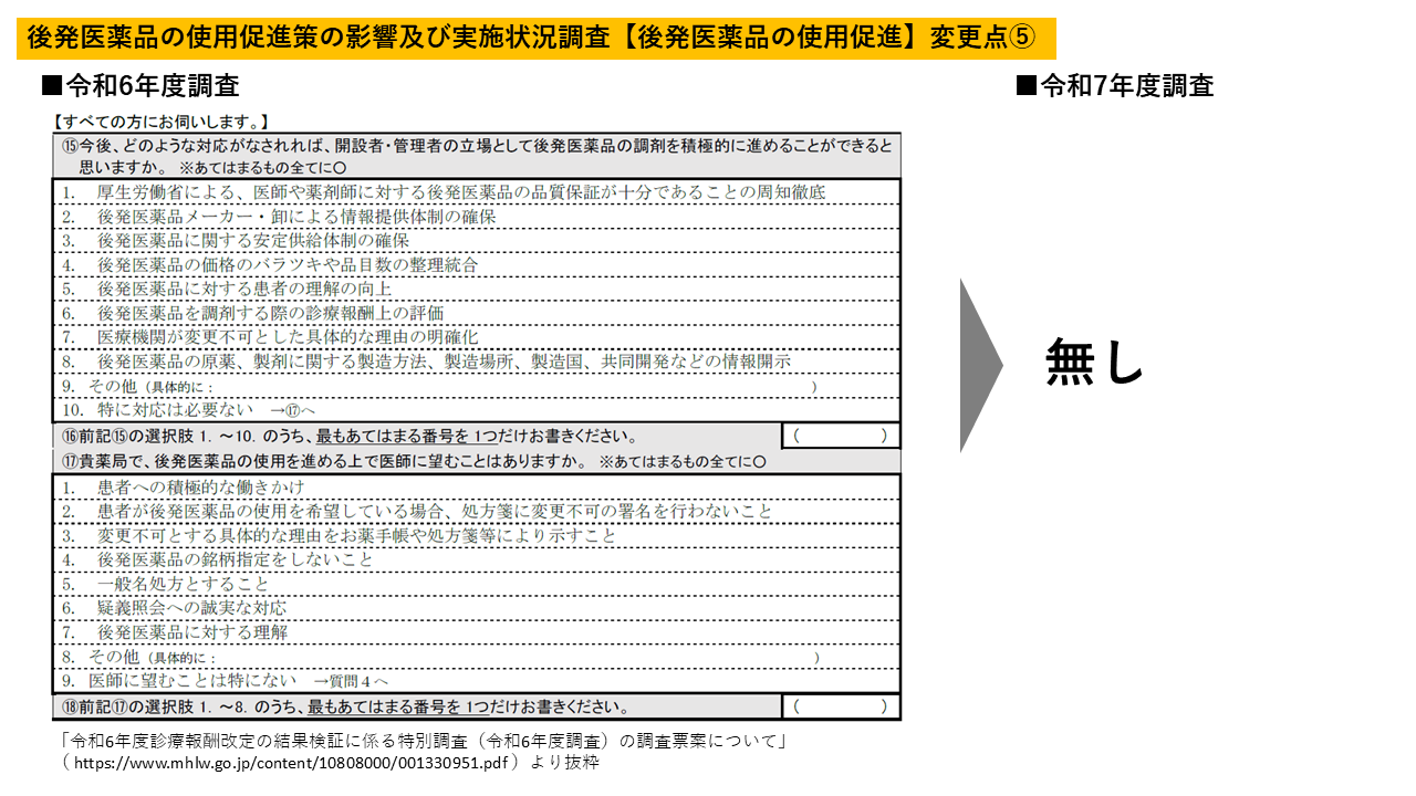 今回の調査では、「一般名処方の状況等」「バイオ後続品の備蓄状況及び対応状況」の設問は、軽微な変更のみです。設問構成や内容は令和6年度調査を踏襲しており、評価の視点や調査対象の範囲も同様です。