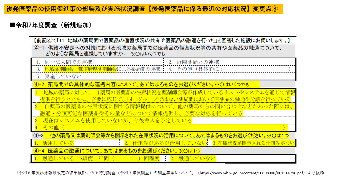 この変更は、医薬品の供給が不安定化する中で、薬局間の在庫融通や情報連携がどの程度機能しているかを把握するための対応と考えられます。調査結果は、薬局ネットワークによる対応力や地域医療への影響を評価する基礎データとして活用されることが想定されます。