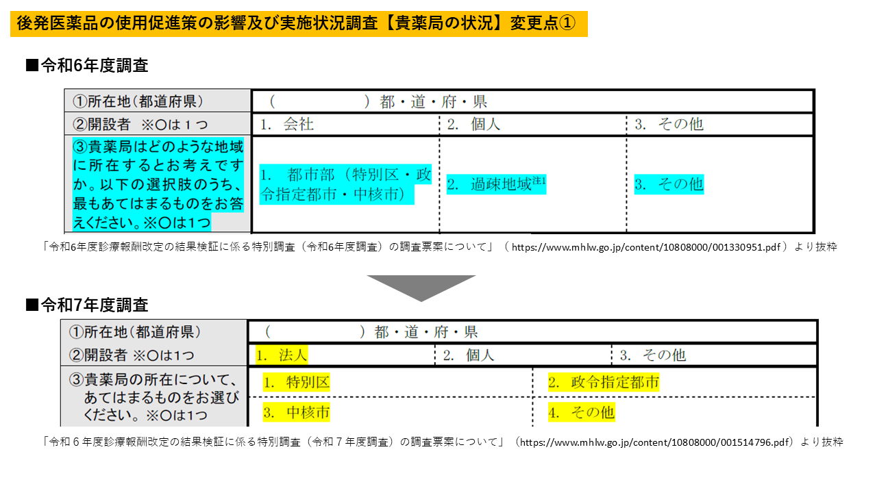 令和7年度調査では、薬局の所在地に関する設問が見直されました。令和6年度調査で設定されていた「都市部/過疎地域/その他」という区分が廃止され、新たに「特別区」「政令指定都市」「中核市」「その他」という4区分へと再編されています。