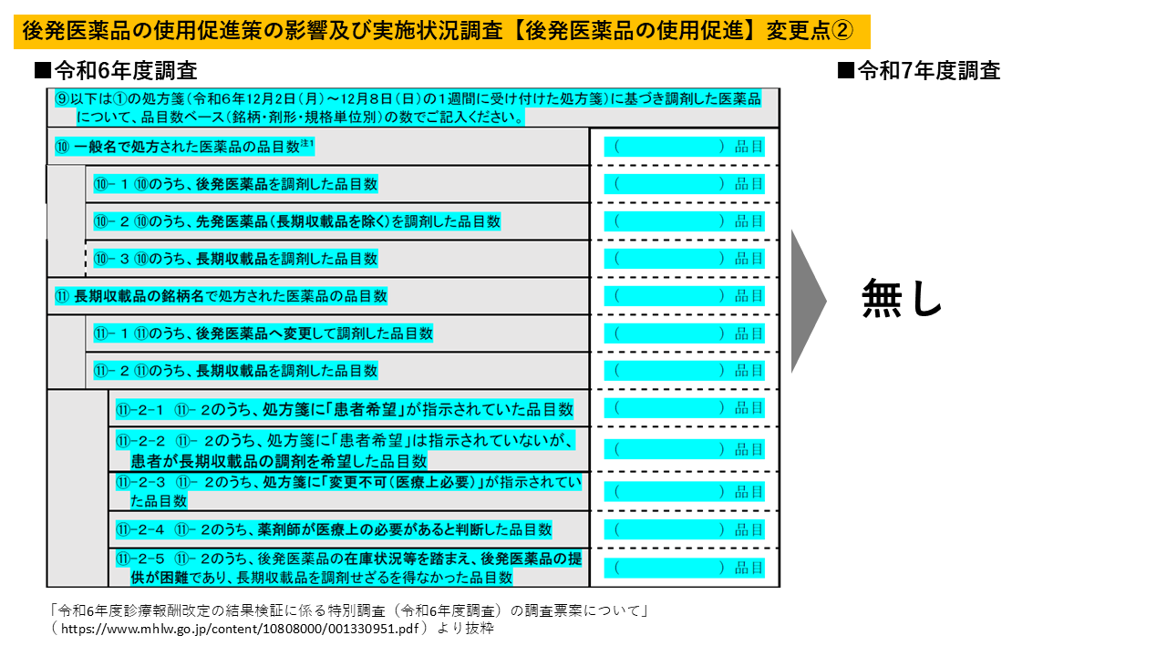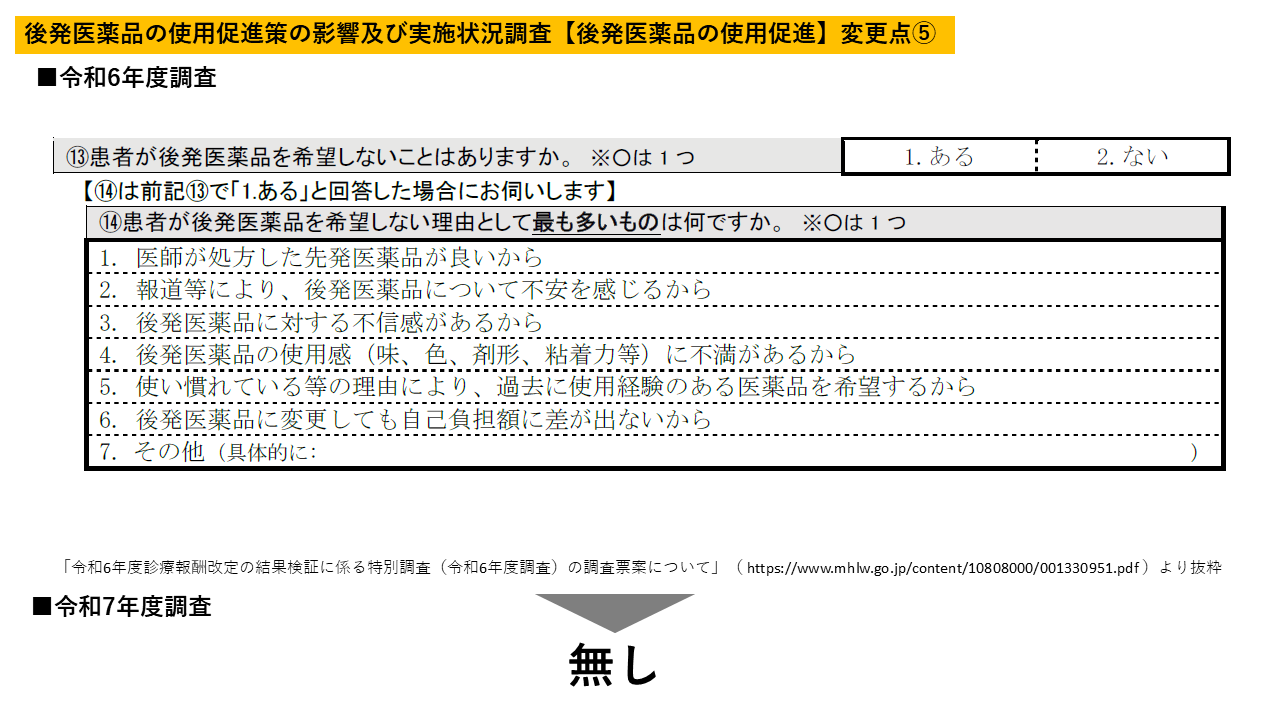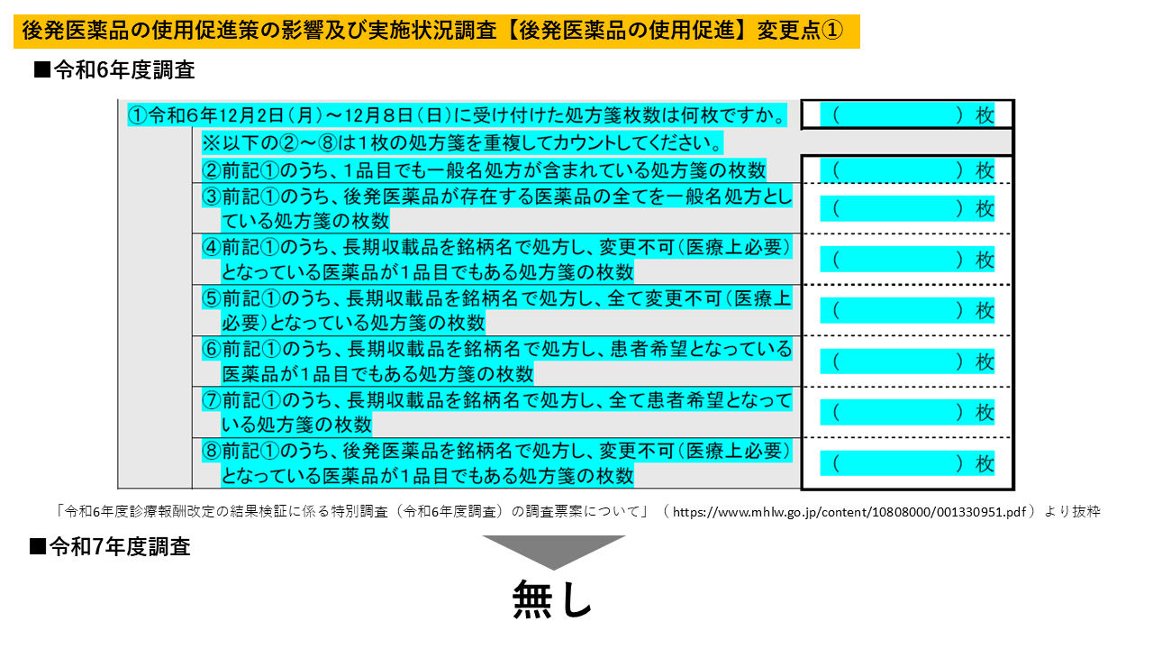 令和6年度調査では処方箋や品目数をベースにした集計が中心でしたが、令和7年度調査では患者希望や医師の指定理由といった要因別の増減状況を把握する方向に整理されました。