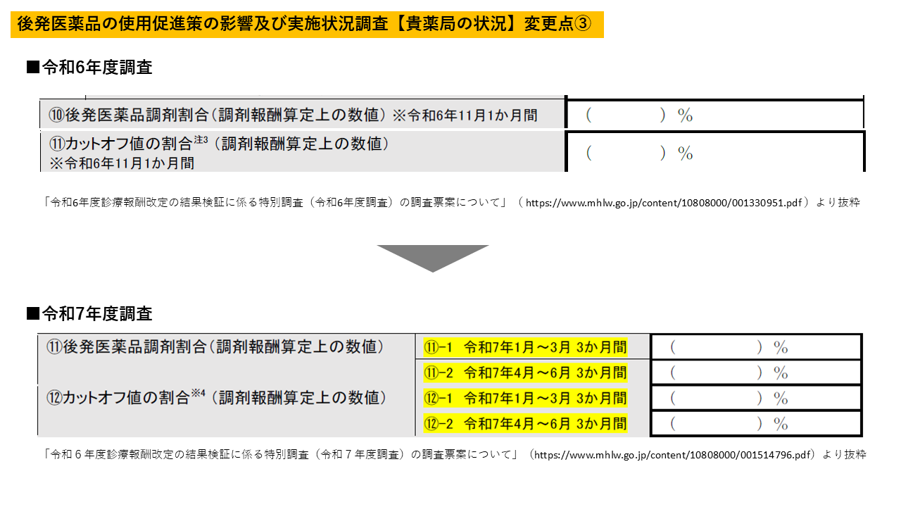 令和7年度調査では、「後発医薬品調剤割合」および「カットオフ値の割合」の設問が見直しされました。令和6年度調査ではいずれも「11月1か月間」での算定状況を回答する形式でしたが、令和7年度調査では「1月~3月」「4月~6月」と3か月ごとの区切りで回答する方式に変更されています。