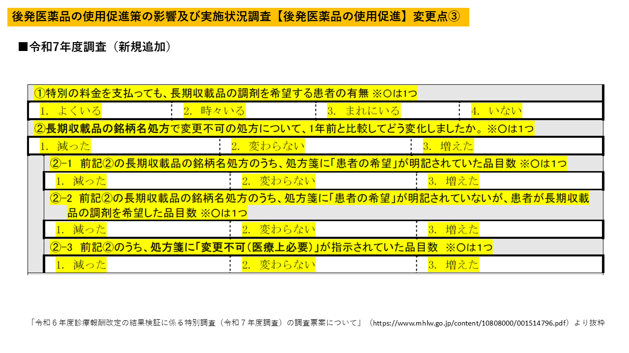 令和7年度調査では、長期収載品の処方に関する新たな設問が追加されました。具体的には「特別料金を支払っても長期収載品の調剤を希望する患者の有無」や、「長期収載品の銘柄名処方で変更不可となっている処方が1年前と比べてどう変化したか」を問う内容です。さらに、その内訳として「患者の希望によるもの」と「医療上必要によるもの」に分けて変化を把握する形式が導入されています。