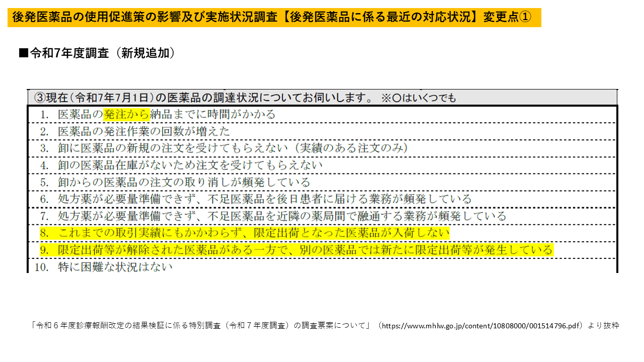 令和7年度調査では、医薬品の調達状況に関する設問に新たな選択肢が追加されました。具体的には、「これまでの取引実績にかかわらず限定出荷となった医薬品が入荷しない」と「限定出荷等が解除された医薬品がある一方で、別の医薬品では新たに限定出荷等が発生している」の2項目です。