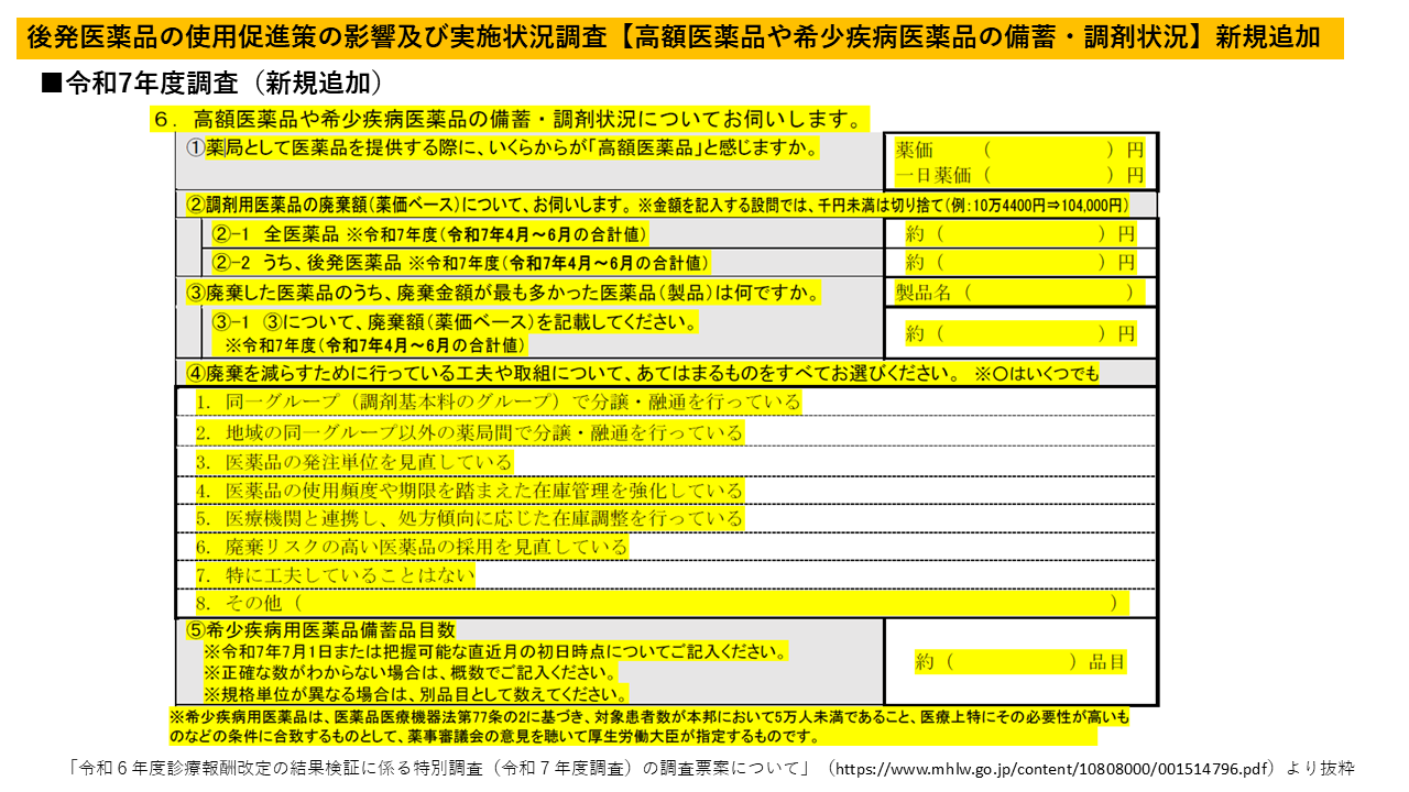 令和7年度調査では、「高額医薬品や希少疾病医薬品の備蓄・調剤状況」を問う章が新設されました。具体的には、薬局が高額と認識する水準や、廃棄に伴う金額、廃棄削減のための取組内容、さらに希少疾病医薬品の備蓄品目数などが設問として追加されています。