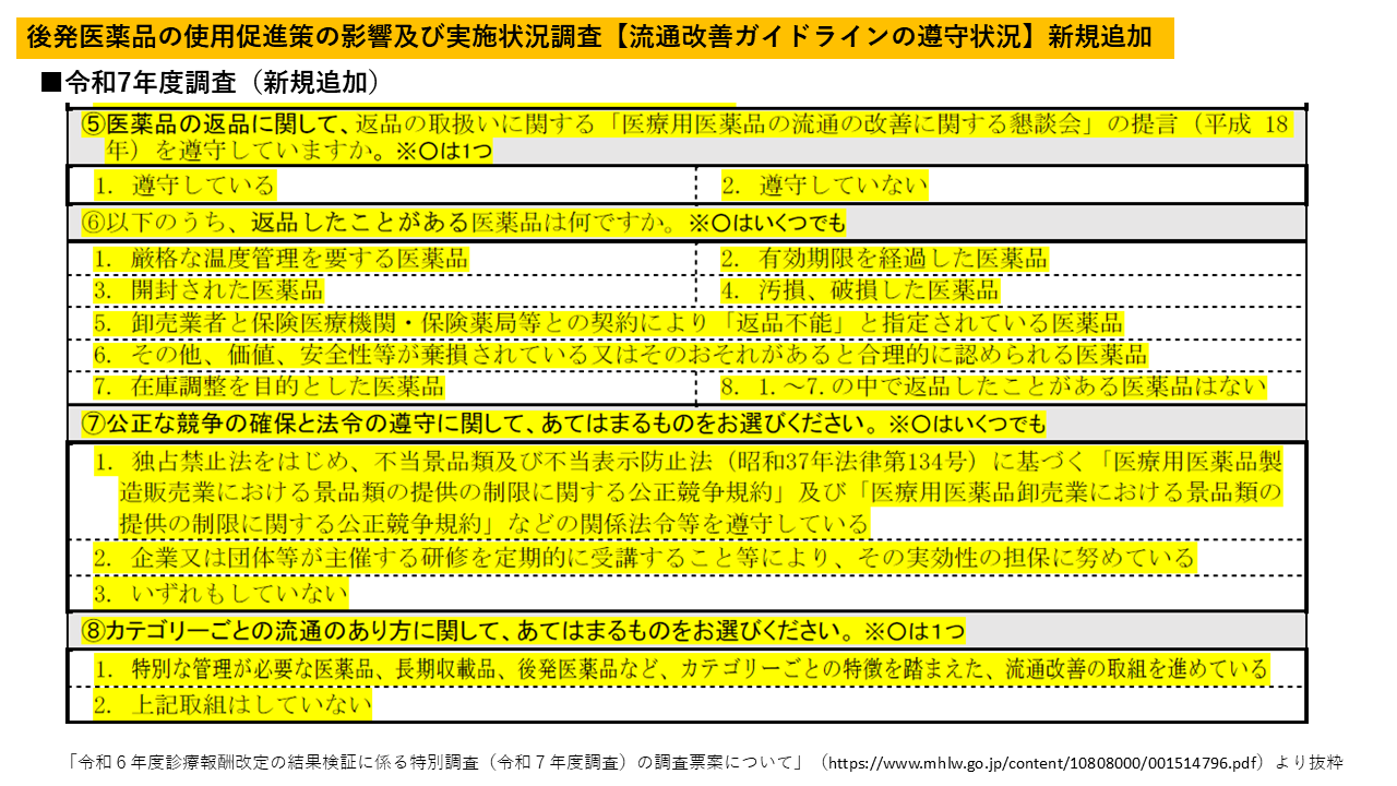 令和6年度調査では薬局や地域内での対応が中心でしたが、今回の追加により、流通段階の卸との連携が調査項目として明確に位置づけられました。薬価改定の影響によって供給不安が顕在化するなか、卸との情報共有がどのように行われているかを把握する狙いがあるといえます。
