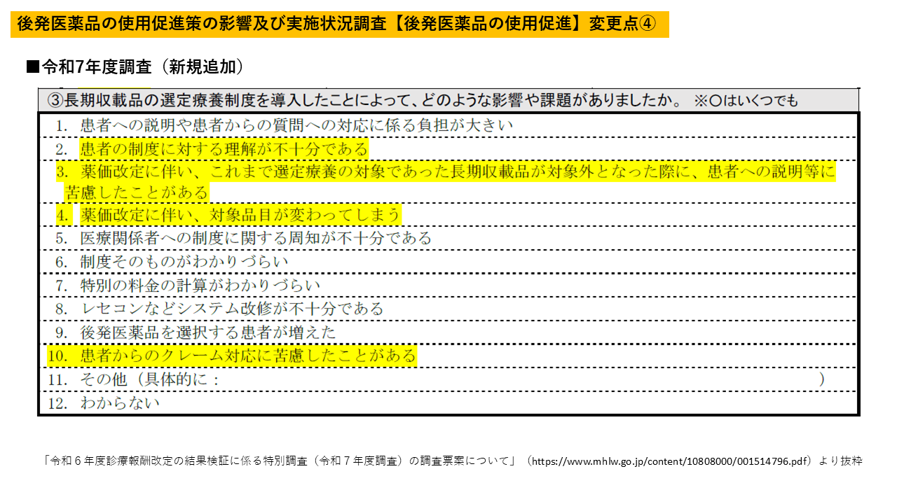 令和7年度調査では、長期収載品の選定療養制度導入への影響・課題に関する設問に新たな選択肢が追加されました。具体的には以下の4項目です。