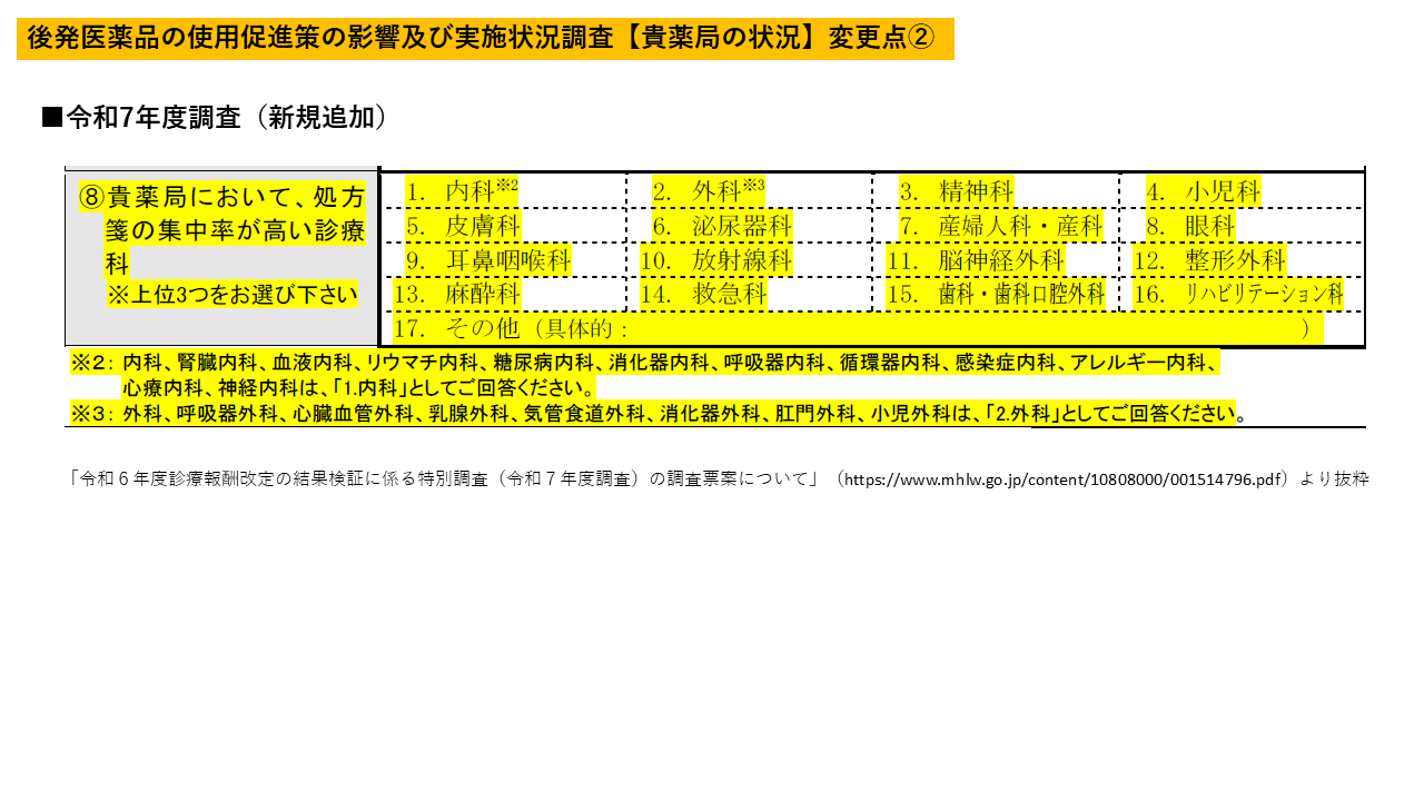 新たに処方箋の集中率が高い診療科を尋ねる設問が追加されました。内科・外科・精神科・小児科など主要診療科に分類されており、上位3つを選択する形式です。