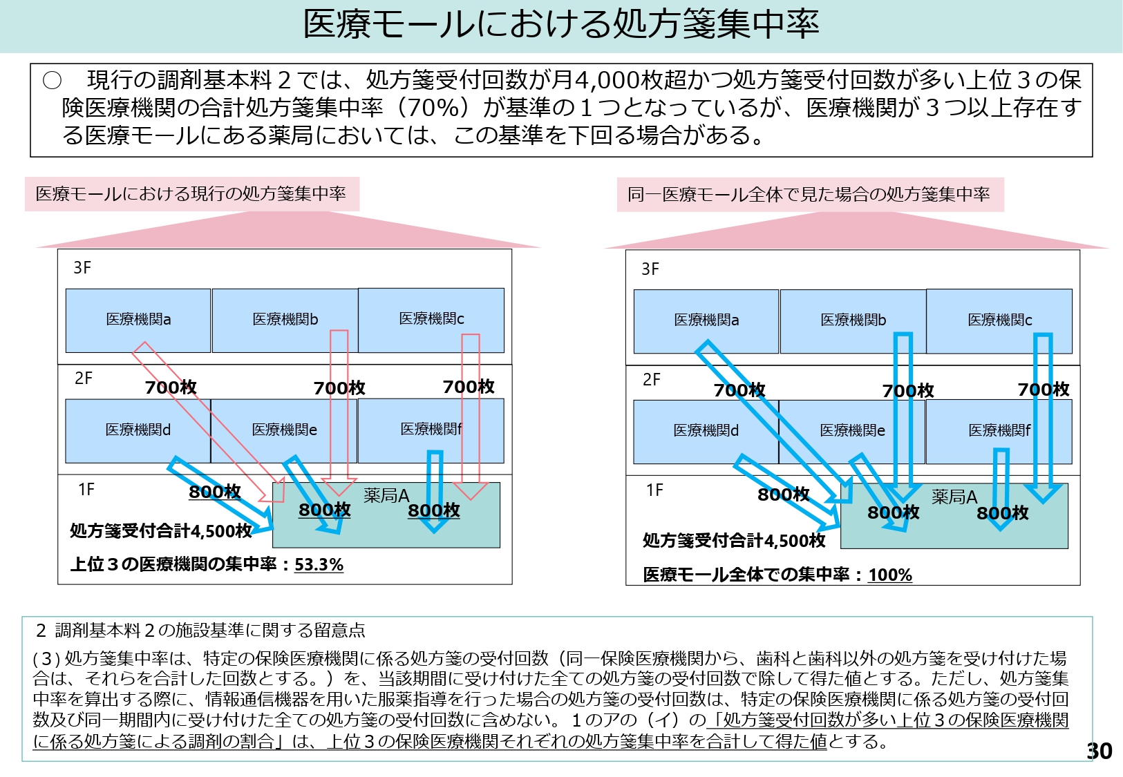資料では、上位3機関では集中率53.3%にとどまるものの、モール全体で見れば実質100%の集中率となっている事例が図示されました。