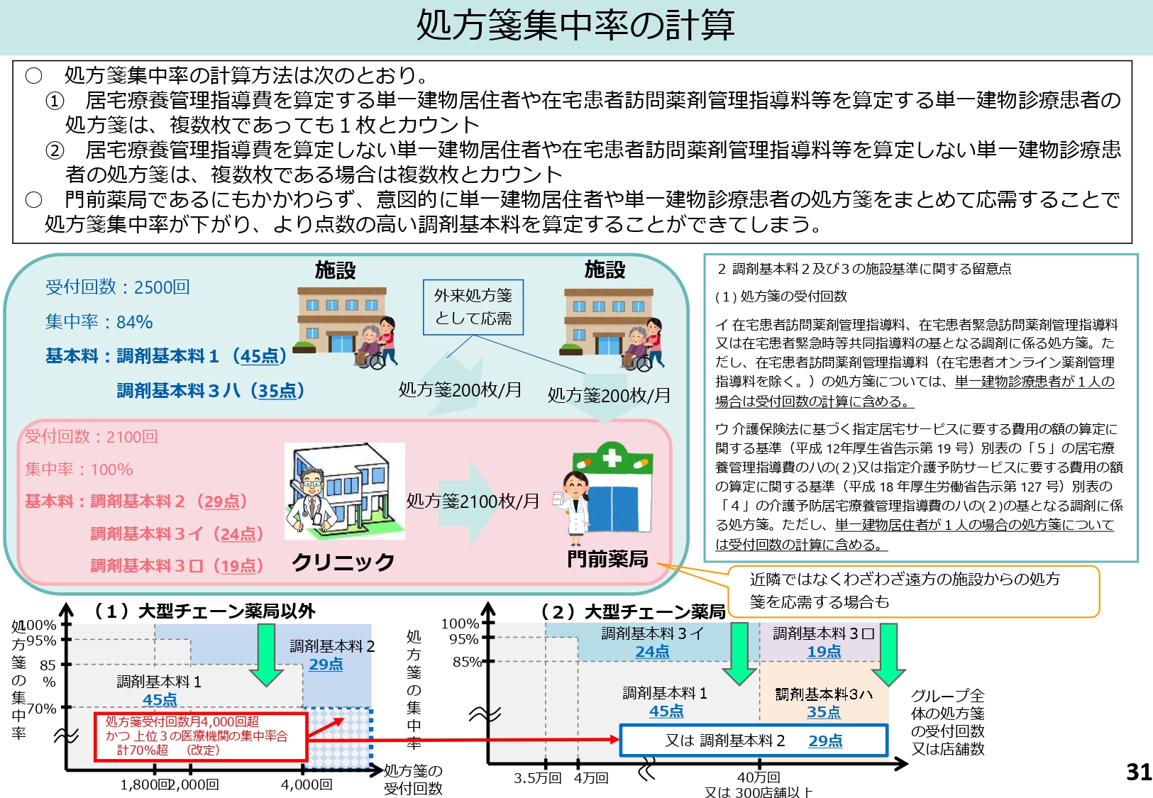 しかし資料では、本来門前薬局であるにもかかわらず、遠方の施設などから処方箋を意図的に「外来処方箋」として大量に応需することで、見かけ上の集中率を下げ、より高い点数の調剤基本料を算定しているケースが指摘されました。