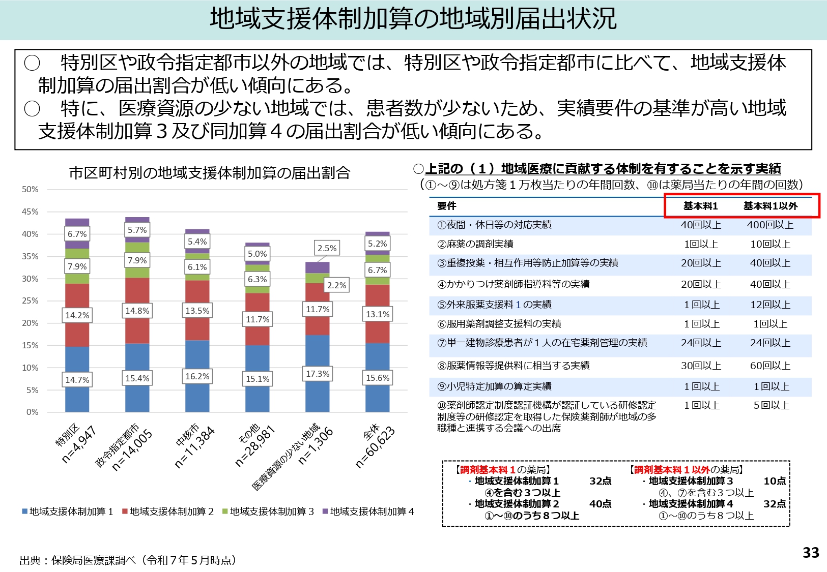 地域支援体制加算についても、興味深いデータが示されました。地域別の届出状況を見ると、「特別区・政令指定都市」に比べて、それ以外の地域では届出割合が低い傾向にあります。