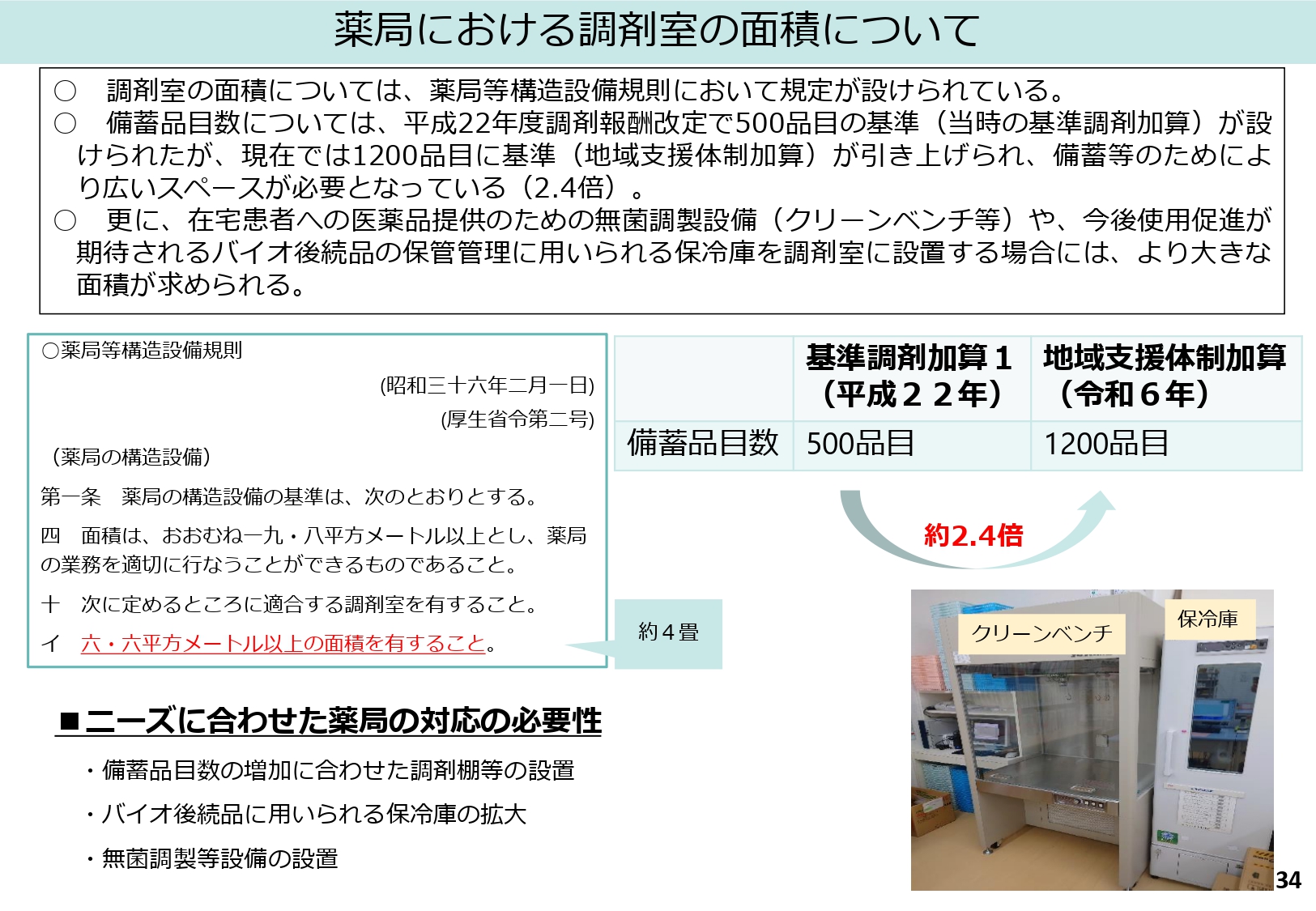 しかし、実際の業務環境は大きく変化しています。備蓄品目数の基準は平成22年の500品目から1,200品目へと約2.4倍に増加しており、さらに在宅医療のための無菌調剤設備や、高額医薬品・バイオ後続品保管のための大型保冷庫など、新たな設備スペースも不可欠になっています。