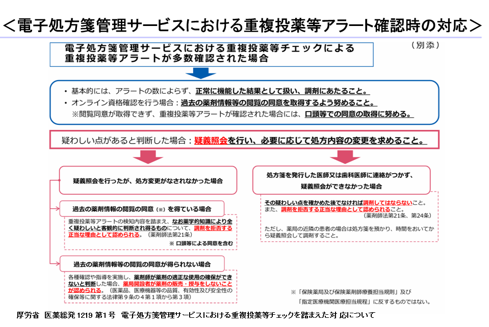 ・疑わしい点があると判断した場合は、疑義照会を行い、必要に応じて処方内容の変更を求める。