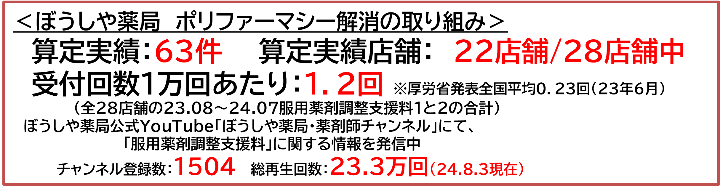 令和6年改定の目玉の一つとして地域支援体制加算の算定要件の見直しが挙げられます。地域支援体制加算2の算定を取り組む上で「服用薬剤調整支援料」の実績要件をクリアすることは大きなポイントとなっていますが、6月発表の社会医療診療行為別統計では、直近(R5.6)の算定の全国平均は1万回あたり0.23回(0.0023%※1・2合計)とこの実績要件に大きく及ばない現状にあります。また、高齢者の害のある多剤服用(ポリファーマシー)は大きな問題となっており、「患者のアウトカムの実現」という観点からも服用薬剤調整支援料の取り組みは重要視されています。